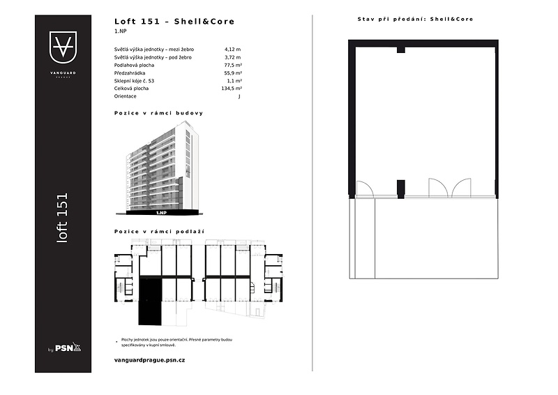 Prostorná jednotka 2+kk s podlahovou plochou 77.50 m² v projektu Vanguard je splněným snem pro ty, kteří chtějí víc než jen bydlení. Otevřený prostor v provedení shell & core vám dává naprostou volnost – vytvořte si domov podle vlastních představ, ať už toužíte po velkorysém obývacím pokoji s kuchyní nebo klidné ložnici se zázemím. Součástí bytu v 1. podlaží je také předzahrádka, která rozšiřuje obytný prostor a poskytuje příjemné místo pro odpočinek s výhledem na okolí. K jednotce náleží sklepní kóje. Vysoký standard budovy zahrnuje prosklenou fasádu, zděné a zdvojené zvukově izolační příčky mezi jednotkami, požárně odolné prosklené příčky, videotelefon, přípravu na exteriérové žaluzie, klimatizaci i rekuperaci. Rezidenti mají k dispozici recepci s concierge službou, wellness a spa zónu, fitness, cinema/party room, prosklený 18metrový bazén, zasedací místnost i prádelnu. Modřany se mění v jednu z nejzajímavějších pražských čtvrtí. Z bývalé průmyslové zóny se stává moderní rezidenční oblast s kompletní občanskou vybaveností, upravenou zelení a výbornou dostupností do centra – autem po nábřeží, tramvají nebo na kole po oblíbené cyklostezce. Jen pár minut od domu se nacházejí mateřské a základní školy, mezinárodní vzdělávací instituce, obchody i sportoviště včetně 9jamkového golfového hřiště. V pěší vzdálenosti najdete kavárny, zdravotnické centrum a další služby, které z Modřan dělají místo pro komfortní každodenní život.