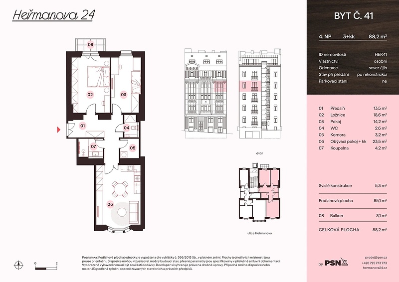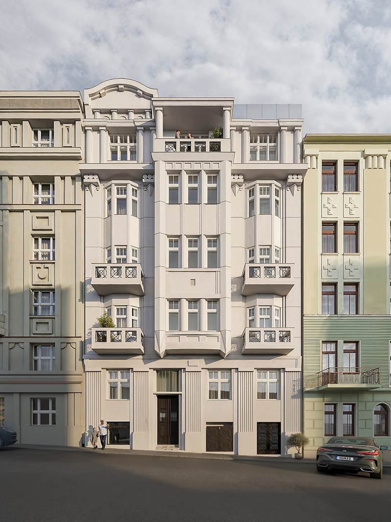 Prostorný a vyváženě řešený byt o dispozici 3+kk a podlahové ploše 85.10 m² je součástí nového rezidenčního projektu Heřmanova 24, který vzniká citlivou rekonstrukcí výjimečného kubistického domu z dvacátých let. Tento architektonický originál s charakterem Letné si zachovává svůj výrazný styl, zatímco interiéry získávají novou úroveň komfortu i řemeslného zpracování. Projekt spojuje silnou identitu domu s nároky současného bydlení a nabízí limitovaný počet bytů s důrazem na detail, materiály a nadčasovost. Dokončení je plánováno na první čtvrtletí 2027. Půdorys bytu ve 4. podlaží zahrnuje obývací pokoj s přípravou na kuchyni, ložnici, vstupní chodbu, koupelnu a toaletu. K jednotce náleží také balkon a sklepní kóje. Vybavení zahrnuje dubové podlahy, dřevěná špaletová okna s dvojsklem, elegantní interiérové dveře, koupelnu s mramorovými obklady se sanitou značek Laufen a Grohe a decentně řešená otopná tělesa a elektroinstalaci, která neruší celkový výraz interiéru. Byt bude dokončen v provedení fit out – připravený k okamžitému nastěhování. Dům po kompletní rekonstrukci má reprezentativní společné prostory, moderní výtah, repasované kamenné schodiště se zdobným zábradlím a nové technické zázemí. Rezidentům je k dispozici sauna a ve vnitrobloku pak klidné místo k posezení mezi zelení. Dům stojí v tiché části ulice Heřmanova na Letné – v místě, kde se setkává městský život s klidem. Jen pár kroků odtud se otevírá Stromovka i Letenské sady, zatímco v okolí najdete oblíbené kavárny, bistra a designové obchody. V docházkové vzdálenosti je Národní galerie, obchodní centrum Stromovka i veškeré služby pro každodenní život. Na Strossmayerovo náměstí dojdete za pět minut, metro Vltavská je v dosahu osmi minut chůze a do centra Prahy se dostanete MHD během dvanácti. Letná nabízí rovnováhu – městskou energii i prostor pro zklidnění tempa. Heřmanova 24 stojí přesně uprostřed.