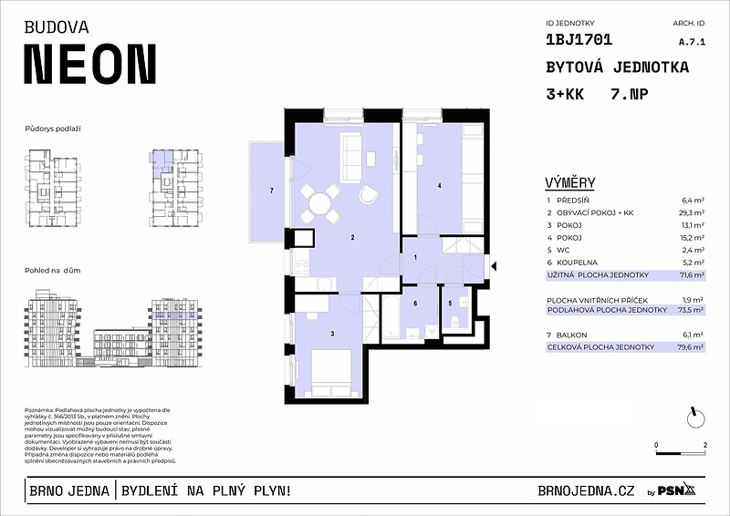 Prostorný byt s balkonem a dvěma ložnicemi je součástí moderní rezidence Brno Jedna, která nabízí pohodlné moderní bydlení s kompletním zázemím a výbornou dostupností do centra města. Jednotka č. 1701 o dispozici 3+kk a celkové ploše 79.60 m² spojuje praktičnost, styl i pohodlí. Dominantou bytu v 7. podlaží je velkorysý obývací pokoj s kuchyňským koutem, které přímo vybízí k setkávání, vaření i relaxaci. Dvě samostatné ložnice poskytují prostor pro klidný spánek, pracovnu nebo dětský pokoj. Koupelna je vybavena moderním vanou a k dispozici je i oddělená toaleta pro maximální komfort každodenního života. Díky orientaci na S, Z je interiér světlý, příjemný a působí vzdušným dojmem. Součástí jednotky je balkón o výměře 6.10 m², ideální pro večerní posezení nebo ranní snídani na čerstvém vzduchu. Byt bude připraven k okamžitému nastěhování s dokončenými finálními povrchy, hotovou koupelnou a místem pro vaši vysněnou kuchyni. Vyšší standard zahrnuje kvalitní dřevěné podlahy, okna s trojskly a u některých jednotek i přípravu na venkovní žaluzie. Brno Jedna přináší nejen domov, ale i životní styl – střešní terasa s grilem, workout zóna, kolárna, prádelna a kočárkárna. V okolí roste nová čtvrť s parkem, cyklostezkami i školkami. Centrum města pak máte na dosah za pouhých 5 minut MHD či autem.