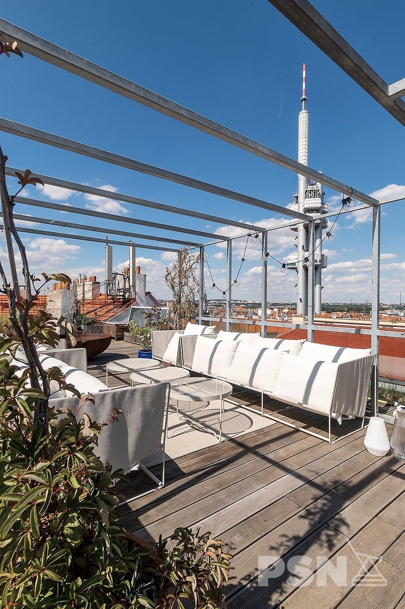 Residence Laubova se nachází v klidné části Vinohrad na Praze 3 v blízkosti metra A Jiřího z Poděbrad. Dům prošel kompletní rekonstrukcí včetně nového výtahu. Možnost parkování přímo v domě. Interiér bytů od architektonického studia Design by Donlic. Nabízíme k pronájmu nádherný prostorný mezonetový byt 4+kk, kde celková plocha bytu vč. tří teras je 454 m2. Obytná plocha bytu je 260,5 m² a jsou zde tři terasy o celkové ploše 193,5 m² s nádhernými výhledy. Střešní terasa s krásným výhledem na kostel na Jiřího z Poděbrad. V bytě se nachází obývací pokoj o rozloze 101m² s luxusní kuchyňskou linkou s vestavěnými spotřebiči a vstupem na terasu, v horním patře bytu jsou 3 ložnice, dvě koupelny s vanou, toaleta zvlášť, prostorná šatna a vstup na střešní terasu. K dispozici je pračka a sušička. Vestavěné skříně, dřevěné podlahy, bezpečnostní dveře, zabudované stropní osvětlení, alarm s možností napojení na PCO, videotelefon.