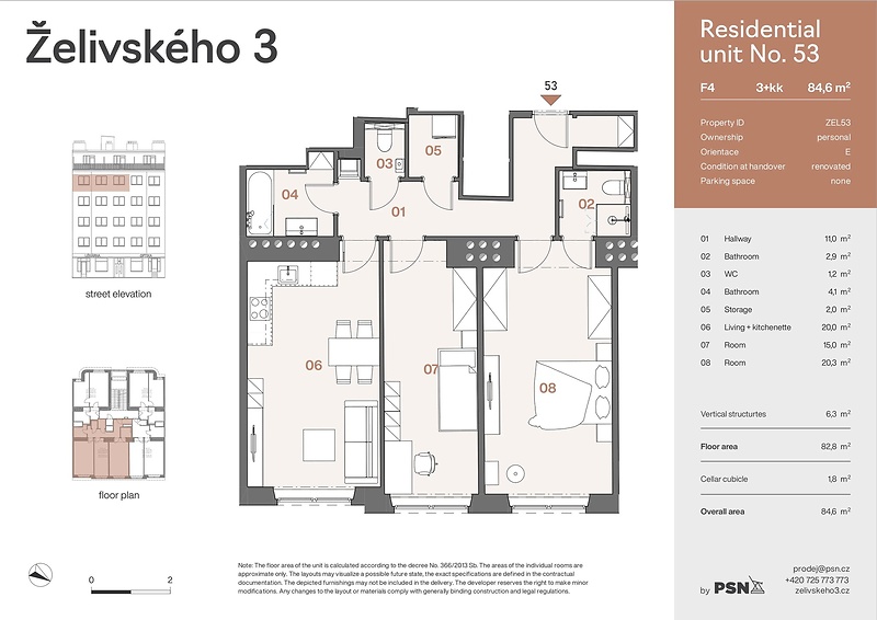 Světlý byt o dispozici 3+kk a podlahové ploše 82.80 m² je součástí projektu Želivského 3, který přináší moderní městské bydlení do tradiční žižkovské zástavby. Dům po kompletní rekonstrukci nabízí komfortní, praktický domov pro každodenní městský život. Půdorys bytu v 5. podlaží zahrnuje obytný prostor s přípravou na kuchyňskou linku, dva samostatné pokoje, vstupní chodbu, komoru, dvě koupelny a toaletu. K jednotce náleží sklepní kóje, která poskytuje praktický úložný prostor navíc. Byt je dokončen v provedení fit out – s novou dřevěnou podlahou a nadčasovou koupelnou vybavenou sanitou značek Laufen a Grohe. Rekonstruovaný dům nabízí klidný vnitřní dvůr se zelení a posezením, prádelnu i malé fitness. Společné prostory po kompletní obnově vytvářejí moderní prostředí odpovídající současným standardům bydlení. Projekt Želivského 3 se nachází v zavedené části Žižkova, jen pár kroků od tramvajové zastávky Nákladové nádraží Žižkov. V okolí je vše, co k městskému životu patří – oblíbené kavárny, restaurace, služby i parky Parukářka a Vítkov. Na metro Želivského se dostanete během několika minut, do centra města pak zhruba za deset.