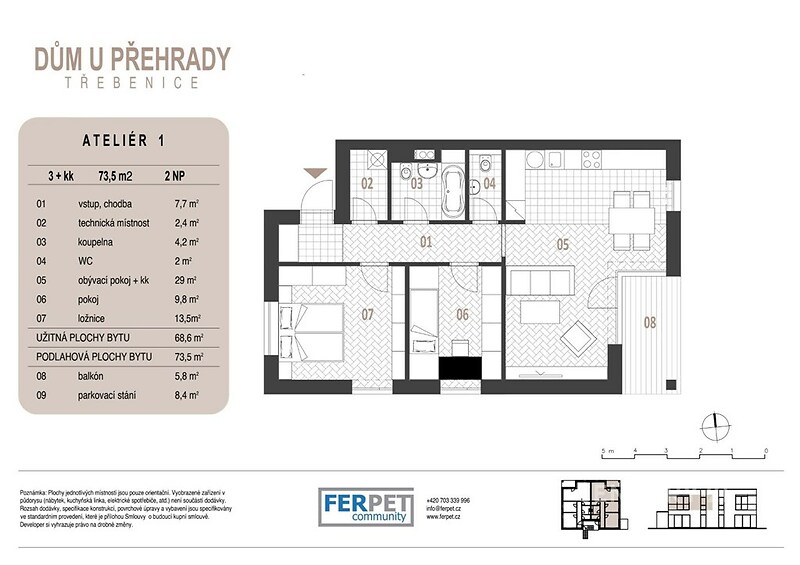Toužíte bydlet kousek od Prahy, ale zároveň mít na dosah klid přírody a Slapskou přehradu? Pak vás tohle místo zaujme. Nabízím moderní byt o dispozici 3+kk v komorní rezidenci se čtyřmi jednotkami, kde si užijete soukromí i pohodlí. Byt je chytře řešený s důrazem na praktičnost – prostorný obývací pokoj s kuchyňským koutem nabízí ideální prostor pro rodinný život i setkání s přáteli. Velkým benefitem je vlastní terasa o velikosti 5,8 m², která poskytuje příjemné místo pro odpočinek. Samozřejmostí je i vlastní parkovací stání. Důležitá informace: Tento byt je kolaudovaný jako ateliér z důvodu stavebního zákona o počtu bytových jednotek v rodinném domě. Dispozičně i standardem je však totožný s druhým bytem na patře a je možné jej bez problémů financovat hypotečním úvěrem. Díky tepelnému čerpadlu a moderním technologiím vás potěší nízké provozní náklady. Lokalita nabízí ideální kombinaci přírody a dostupnosti města: • Slapská přehrada v pěší vzdálenosti • Široké možnosti sportu, relaxace i gastronomie v okolí • Praha cca 30 minut autem Tato nemovitost spojuje moderní komfort s přírodou a představuje skvělou volbu jak pro vlastní bydlení, tak i jako investici. Zavolejte a domluvte si prohlídku – osobní návštěva vás přesvědčí nejlépe.