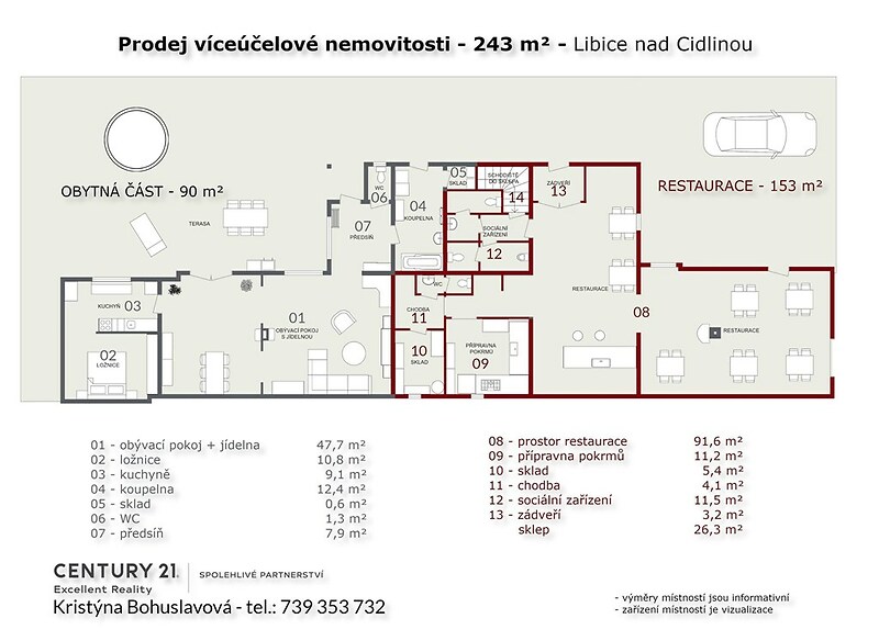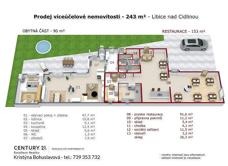 UPOZORNĚNÍ K DOSTUPNOSTI: V termínu 10. 01. – 18. 01. 2026 se nacházím na zahraniční cestě mimo EU (omezený roaming). Dotazy a prohlídky prosím zasílejte výhradně přes kontaktní formulář u inzerátu, emailem nebo přes aplikace WhatsApp, Viber, Messenger. Na zprávy odpovím hned, jakmile budu v dosahu sítě. Plně k dispozici Vám budu od pondělí dne 19. 01. 2026. Děkuji za pochopení. Nabízíme Vám ke koupi víceúčelovou stavbu o užitné ploše 243 m² a celkovou výměrou pozemku 1874 m² v obci Libice nad Cidlinou nedaleko lázeňského města Poděbrady. Jedná se o bývalou restauraci/ hospodu s obytnou částí a rozlehlou zahradou s bazénem. Nemovitost je vhodná k bydlení spojená s podnikáním, resp. variant je tu mnoho, jak využít tuto nemovitost. Obytná část o dispozici 2+1 je částečně zateplená a má plastová okna. Vytápění krbovými kamny, krbem a přímotopy, elektřina v mědi, ohřev vody el. bojlerem, obecní vodovod a kanalizace. Na pozemku u obytné části se nachází ovocné stromy, betonový bazén, vlastní studna, dřevěná kolna a zděný zahradní domek (dílna) na nářadí apod. Přední část nemovitosti je bývalá restaurace/ hospoda s dvorkem, kde lze parkovat. Poté navazuje obytná část se zahradou, kde je samostatný vstup přes vrátka či vjezd přes vrata. Obytná část tedy nabízí dostatek soukromí. Obytná část (90 m²): zádveří/ předsíň s velkým oknem obývací pokoj s jídelnou, krbovými kamny, krbem a vstupem na terasu přes francouzské okno koupelna s vanou a vstupem na zahradu + technická místnost/ sklad samostatné WC ložnice V obci je následující vybavenost, tj. ZŠ (9ti letá), MŠ, obchod, řeznictví, obecní úřad, kulturní dům, pošta, restaurace, dětské a fotbalové hřiště, jezero atd. Obec pořádá či organizuje zábavu pro dospělé i děti, a to například čarodějnice, plesy, vinobraní, masopust, posvícení apod. Výborná dopravní dostupnost autobusové zastávky, vlaková stanice a v blízkosti dálnice D11. Cesta do Prahy automobilem na Černý Most trvá cca 30 minut. Libice nad Cidlinou spadají pod nedaleké město Poděbrady, kde je veškerá občanská vybavenost. V případě zájmu o prohlídku či o více informací mne prosím kontaktujte.