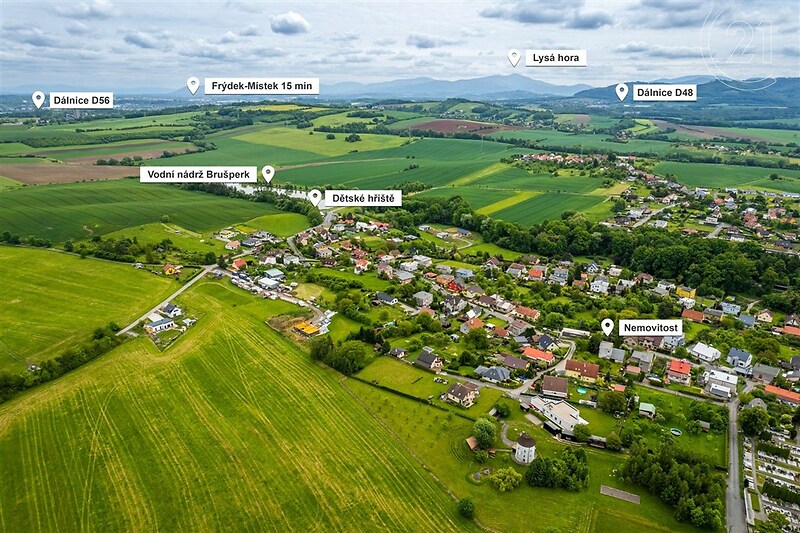 V exkluzivním zastoupení majitele Vám nabízím na prodej rodinný dům v městečku Brušperk na Frýdeckomístecku, v malebné lokalitě v blízkosti podhůří Beskyd. Celková plocha pozemku je 1240 m2, zastavěná plocha činí 302 m2. Dům má dvě nadzemní podlaží a je kompletně podsklepený. V přízemí se nachází kuchyně, obývací pokoj, komora a toaleta. V prvním patře jsou dva průchozí pokoje a koupelna. Z chodby je vstup na malý balkónek a také vstup na střechu garáže. Dům postaven v 50. letech, je cihlový, nezateplený. Původní dřevěná špaletová okna, podlahy – parkety a dřevo, původní rozvody. Střecha plochá, pozink a lepenka, oprava proběhla v roce 2024. K domu přiléhá garáž o velikosti 63 m2, původně postavená pro dva nákladní vozy, později využívaná jako dílna. Do domu jsou přivedeny veškeré inženýrské sítě. Celý pozemek je oplocený, na zahradě, která má plochu více než 900 m2 jsou ovocné stromy, v přední části jehličnany a keře. Za domem je dřevník a jímka na dešťovou vodu. Na rekonstrukci a opravu domu lze využít dotační programy (dotace na výměnu zdroje tepla, zateplení, výměnu oken, dveří a další). Brušperk leží v nádherné krajině na dohled od Beskyd, vedou zde cyklostezky, na okraji města je vodní nádrž s pláží, stánky a odpočinkovou plochou. Pro další informace mě prosím kontaktujte.
