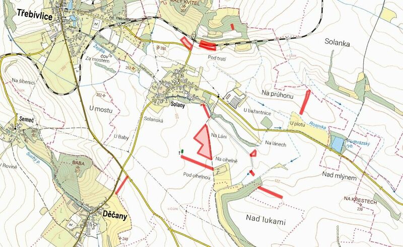 V katastrálním území Solany, obec Děčany, okres Litoměřice, nabízíme k prodeji rozsáhlý komplex pozemků ve výlučném vlastnictví o celkové výměře 75 550 m. Pozemky jsou zapsány na listu vlastnictví č. 59. Jedná se o parcely č.: orná půda: 105, 163, 229, 345/1, 345/2, 431, 540, 576, 597/32, 661/12, 685, 689/3, 769 - celkem 73 962 m trvalý travní porost: 273, 300/4, 300/5, 309 - celkem 2 928 m ostatní plocha: 100/6, 344/3 - celkem 972 m vodní plocha: 660/14, 816/42 - celkem 173 m Pozemky tvoří pestrý soubor zemědělsky využitelných ploch - s převahou orné půdy, doplněné o trvalý travní porost, vodní a ostatní plochy. Všechny jsou situovány v jednom katastrálním území, což usnadňuje správu i případné hospodaření. Pokud máte zájem nebo dotazy, neváhejte mě kontaktovat na uvedeném telefonním čísle nebo e-mailové adrese. V uvedené ceně je již zahrnuta provize. Součástí prodeje je také zpracování administrativy a související právní služby. Majitel si vyhrazuje právo vybrat kupujícího na základě nabídky.