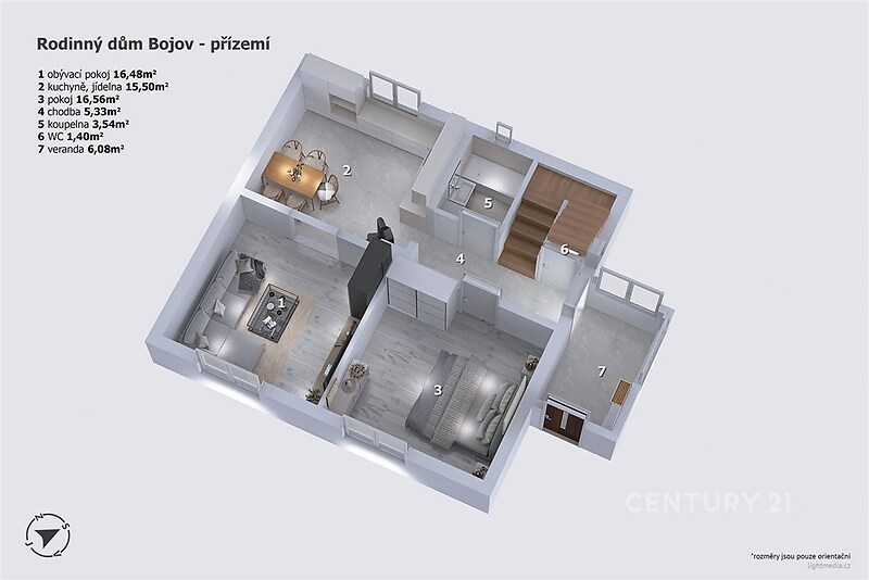 V místě, kde rána začínají tichem, zpěvem ptáků a výhledem do zeleně, stojí dům, který dává prostor skutečnému rodinnému životu. V klidné části Bojova, obklopené zahradami, loukami a lesy, najdete domov, kde má každý člen rodiny své místo a kde se život zpomaluje přirozeným tempem. Prostorný rodinný dům o dispozici 5+1 nabízí dostatek místa pro každodenní fungování i společné chvíle. Užitná plocha cca 110 m² nabízí pohodlné a praktické bydlení, které je připravené k užívání a zároveň dává možnost doladit si interiér podle vlastních představ. Velká zahrada pak přímo vybízí k dětským hrám, rodinným oslavám, letnímu posezení na terase nebo klidným večerům s výhledem do okolní krajiny. Právě propojení domu, zahrady a okolní přírody dává tomuto místu výjimečnou atmosféru. Bojov je malá, klidná vesnice, ideální pro ty, kteří hledají bezpečné a přátelské prostředí pro rodinu. V okolí jsou lesy, louky a minimum ruchu, přesto zde nechybí základní občanská vybavenost – mateřská a základní škola, pošta, obecní úřad, malé obchody i místní hospoda. Vše je dostupné bez stresu a spěchu. Jen pár minut jízdy odsud leží Mníšek pod Brdy, kam se dostanete přibližně za 10 minut jízdy. Zde najdete kompletní občanskou vybavenost – supermarkety, restaurace, kavárny, lékaře, sportoviště, kulturní vyžití i další školy. Díky tomu máte klid venkova, ale zároveň komfort města na dosah. Velkou výhodou je také dobrá dostupnost do Prahy, kam se pohodlně dostanete přibližně za 30–35 minut, a to jak autem, tak veřejnou dopravou. Každodenní dojíždění je reálné a pohodlné, což z této lokality dělá ideální volbu pro ty, kteří chtějí bydlet v přírodě, ale pracují ve městě. Tento dům není jen nemovitost. Je to místo, kde může vzniknout skutečný domov – pro rodinu, která hledá prostor, klid, soukromí a blízkost přírody, aniž by se musela vzdát dostupnosti města.