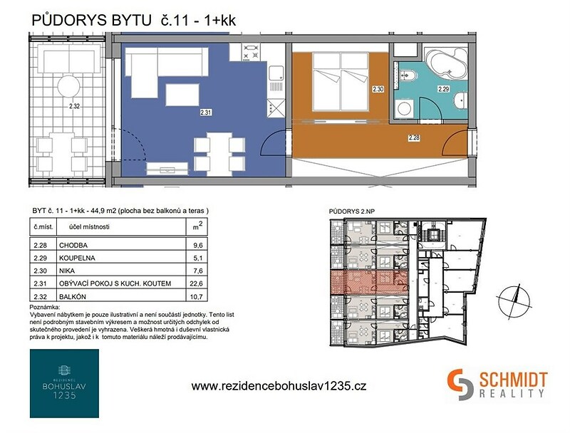V zastoupení majitele si dovolujeme nabídnout pronájem bytu 2+KK, který je umístěn v novostavbě bytového domu (Rezidence Bohuslav 1235) na ulici Gajdošova v Brně. Byt disponuje plochou 44,9 m2 a dále k němu patří prostorný balkon s plochou 10,7 m2 orientovaný do nově vybudovaného společného vnitrobloku. Byt je umístěn ve 2. nadzemním podlaží v budově s výtahem. Byt se nabízí nezařízený. Vybaven je kuchyňským koutem s lednicí a mrazákem, indukční varnou deskou s digestoří, elektrickou troubou a dřezem. Koupelna je společná s toaletou a je zařízena rohovou vanou. Zbývá také dostatek místa pro pračku a sušičku. Dispozice se skládá z prostorného obývacího pokoje odkud vede vstup na terasu. Ložnice je oddělena příčkou a prosvětlena je světlíkem nad kuchyňskou linkou. O ohřev vody a topení se stará domovní kotelna na plyn. Do domu je zaveden také optický internet od společnosti Pe3ny.net. Měsíční náklady spojené s pronájmem činí 16.900 Kč nájemné + 4.000 Kč záloha za energie a služby. Kauce je ve výši 44.000 Kč a provize RK činí 21.900 Kč včetně DPH. Prohlídky jsou možné po předchozí telefonické dohodě. Byt je k nastěhování od 1. 11. 2025 nebo po dohodě se současnými nájemníky.