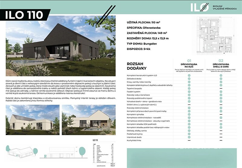 Ve spolupráci s majitelem pozemku, vám exkluzivně nabízíme jedinečnou příležitost pořídit si úspornou dřevostavbu na klíč – model ILO 110. Tato nabídka zahrnuje prostorný pozemek o velikosti 868 m² včetně zajištění kompletní výstavby. Co je zahrnuto v ceně? Pozemek i dům s kompletním dokončením interiéru, včetně projektové dokumentace, ČOV, retenční nádrže, přípojek a základních terénních úprav. Vybavené koupelny a WC – včetně sanitární výbavy. Vnitřní dveře, podlahové krytiny, obklady a dlažby – vše ve vysoké kvalitě. Moderní design a praktické řešení pro pohodlné bydlení. Upozornění: Kuchyňská linka není součástí dodávky, abyste si ji mohli přizpůsobit svým představám. Proč si vybrat právě tento dům? ✅ Nízké náklady na bydlení: Úsporná dřevostavba s kvalitním zateplením. ✅ Komfortní teplo: Teplovodní podlahové vytápění s tepelným čerpadlem a TUV nádrží. ✅ Kompletní infrastruktura: Napojení na všechny inženýrské sítě. ✅ Ekologické řešení: Retenční nádrž na dešťovou vodu. ✅ Připraveno k životu: Včetně základních terénních úprav. Přizpůsobte si ho podle sebe! Máte možnost ovlivnit vzhled svého nového domova: Vyberte si odstíny vinylových podlah, koupelnových obkladů a dekorů dveří. Zvolte si ze dvou odstínů venkovní fasády, které se vám nejvíce líbí. Dispozice a parametry: Typ domu: Bungalov Dispozice: 5+kk Užitná plocha: 110 m² Zastavěná plocha: 149 m² Rozměry domu: 13,5 x 13,9m Nenechte si ujít tuto jedinečnou šanci na moderní a úsporné bydlení! Podrobný popis dřevostavby a půdorys naleznete v galerii. Zaujala vás tato nabídka? Kontaktujte nás ještě dnes a domluvte si prohlídku!