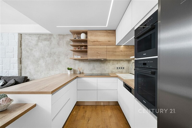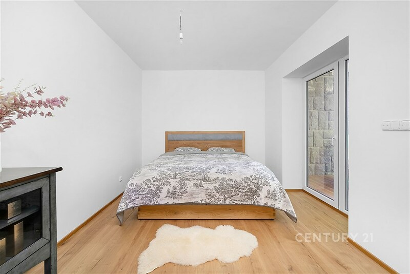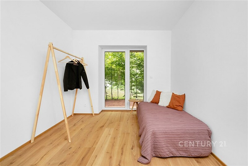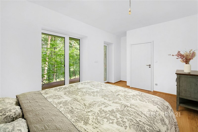 Vítám vás v tomto exkluzivním bytě 3+kk o rozloze 89 m², ke kterému náleží tři terasy o celkové ploše přibližně 35 m², přístupné přímo z obytných místností. Byt je umístěn v přízemí moderního domu v atraktivní lokalitě Brno – Bystrc, Jelenice. Nachází se v srdci přírody, pouhých 120 metrů od Brněnské přehrady, na okraji lesa. Propojení komfortu a přírody Každá obytná místnost má vlastní dřevěnou terasu s výhledem do zeleně, kde si můžete užívat klid, soukromí a ničím nerušený kontakt s okolní přírodou. Z ložnice je nádherný výhled na Brněnskou přehradu – v zimě otevřený, v létě chráněný svěží zelení lesa. Velká francouzská okna zajišťují dostatek denního světla a maximální propojení interiéru s exteriérem. Moderní interiér a nadstandardní vybavení Byt byl dokončen v roce 2021 s důrazem na kvalitu použitých materiálů a maximální komfort. Interiéry jsou ve stavu novostavby. Srdcem bytu je kuchyň na míru od renomované firmy Klvaňa, vybavená prémiovými spotřebiči Miele a Liebherr. Podlahy z přírodního kartáčovaného dubu jsou pouze olejované, aby vynikla jejich přirozená kresba. Obývací část zdobí originální kamenná stěna z místního přírodního kamene, která propojuje interiér s okolní krajinou. Koupelna v čistém spa stylu je vybavena sanitou Hansgrohe a Villeroy & Boch, prostorným sprchovým koutem, přípravou pro volně stojící vanu a elegantním obkladem z italského kamene. Komfortní klima a nízké náklady O tepelný komfort se stará nové tepelné čerpadlo pro celý dům, podlahové vytápění s individuální regulací v každé místnosti a energetická náročnost budovy třídy B. Dům má vlastní studnu, což zajišťuje energetickou soběstačnost a nízké provozní náklady. Bezpečnost zajišťuje kamerový systém a bezpečnostní fólie na oknech s certifikací. Součástí objektu je i útulný sklípek – po dohodě se správcem možno využívat na společenské akce. Praktické detaily a úložné prostory K bytu náleží prostorná sklepní kóje (4,7 m²) se zabezpečením dvojitým zámkem, multifunkční místnost (šatna/komora/spíž), vestavná skříň na míru a parkovací místo č. 7 přímo před hlavním vchodem do domu. V zadní části domu jsou k dispozici další parkovací stání s možností dokoupení. V domě je uzamykatelná kolárna a kontejnery na tříděný odpad. Lokalita a dostupnost Jelenice nabízí jedinečné propojení moderního bydlení a aktivního životního stylu v přírodě. Přímo za domem najdete cyklostezky, turistické trasy, plážový volejbal, možnost koupání v přehradě nebo dopravu parníkem. Zastávka Jelenice je jen pár kroků od domu – autobusová linka č. 303 vás dopraví do centra Brna každých 30 minut ve špičce. Každodenní pohodlí doplňuje dostupnost rozvozových služeb (Rohlík, Košík, restaurace). Tento byt je ideální volbou pro ty, kteří hledají moderní, komfortní a bezpečné bydlení v těsném spojení s přírodou, ale zároveň s výbornou dostupností do centra města. Tak co říkáte na tento moderní byt? Ozvěte se mi – rád vám nemovitost ukážu osobně!